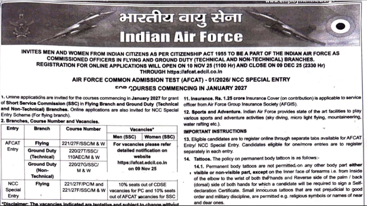 नोट: भारतीय वायु सेना भारत सरकार और भारतीय वायु सेना के नियमों के अनुसार विभिन्न श्रेणियों के लिए आयु में छूट प्रदान करती है। आयु की गणना 01 जनवरी 2027 तक की जाती है।