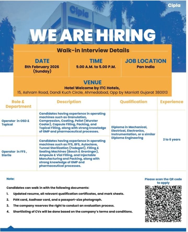 India ke pharmaceutical sector me agar kisi company ka naam trust, quality aur global presence ke liye jana jata hai, to woh Cipla Limited hai. February 2026 me Cipla ne Ahmedabad me ek mega walk-in interview announce kiya hai, jo experienced diploma holders ke liye ek golden opportunity hai. Ye recruitment drive un candidates ke liye specially design ki gayi hai jinke paas OSD, Topical ya Sterile manufacturing operations ka real-time industry experience hai.