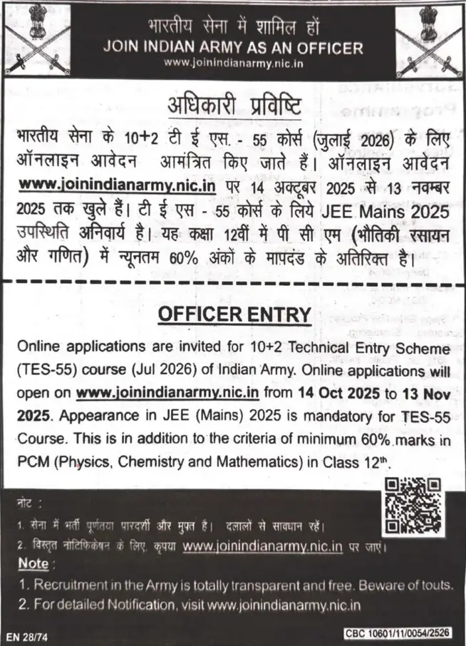 © 2025 आर्मी 10+2 टीईएस 55 भर्ती सूचना