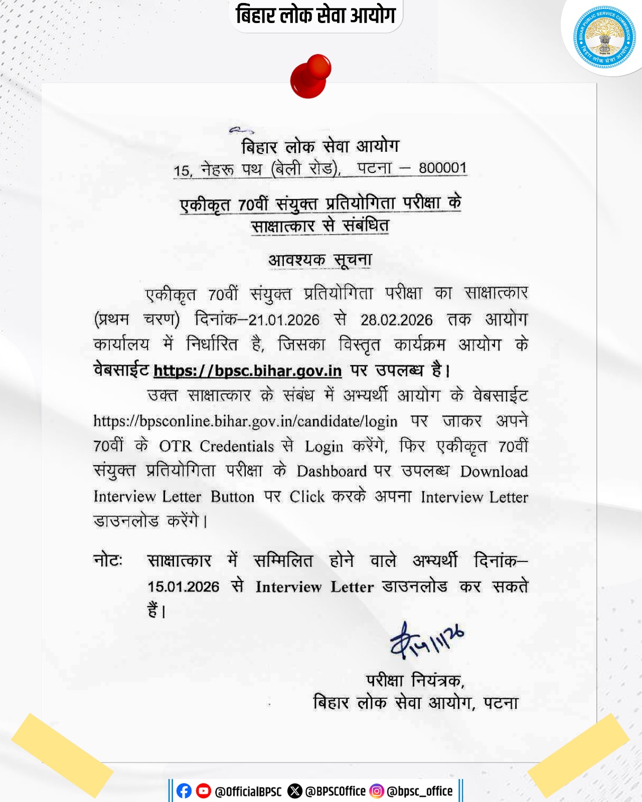 BPSC 70th Interview Letter 2026 candidates ke liye career-defining moment hai। Agar aapne mains qualify kar liya hai, to interview preparation par focus karein aur official website regularly check karte rahein।