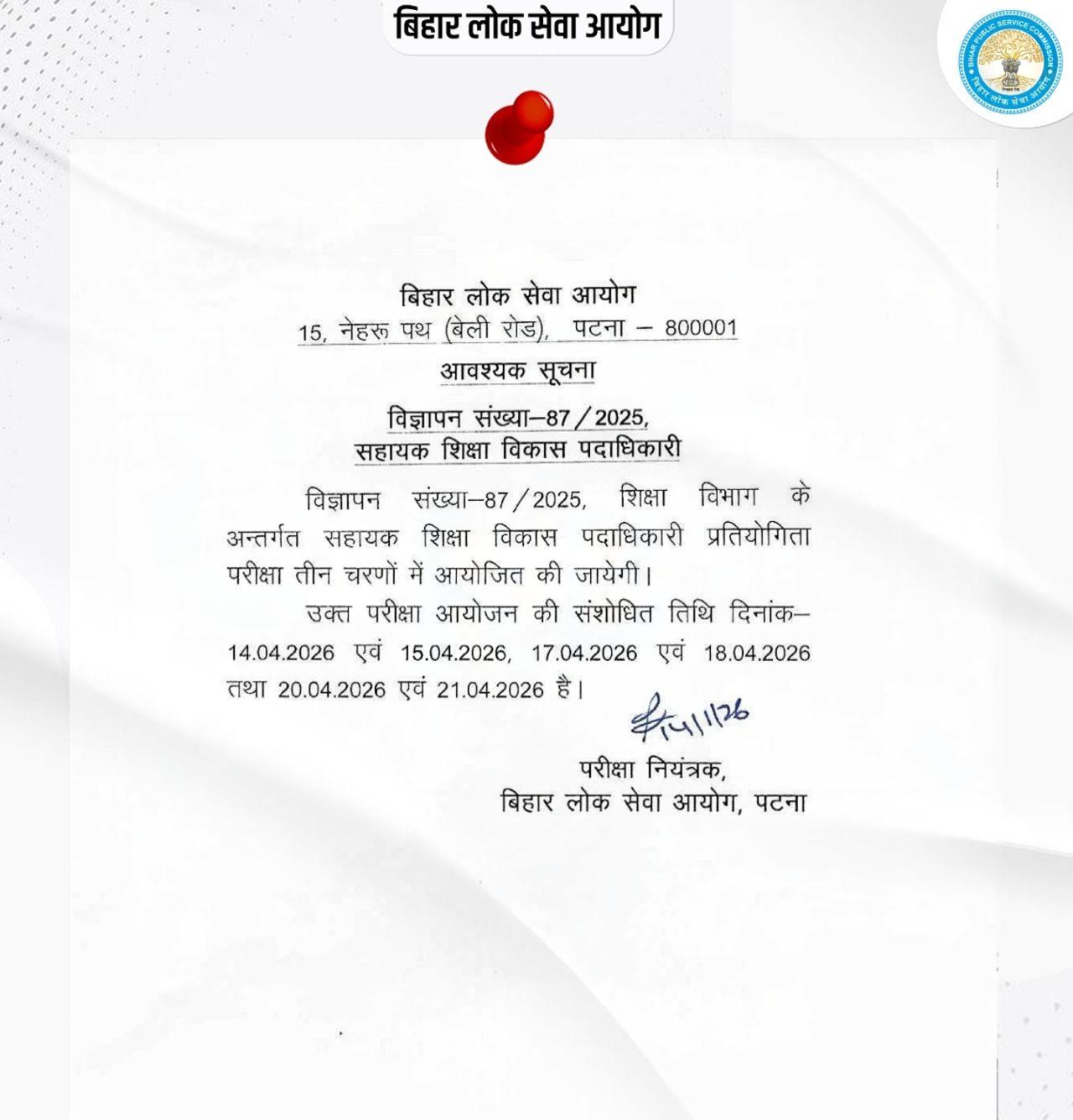 | BPSC AEDO New Exam Date 2026 | April 14, 15, 17, 18, 20, 21, 2026 | Scheduled New |