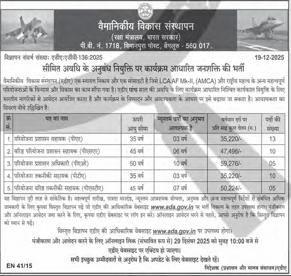 Aerospace Development Agency (ADA), जो कि DRDO (Defence Research & Development Organisation) के अंतर्गत काम करती है, ने ADA Recruitment 2026 के तहत Project Assistant और Project Officer जैसे high-profile पदों पर भर्ती के लिए official notification जारी किया है।