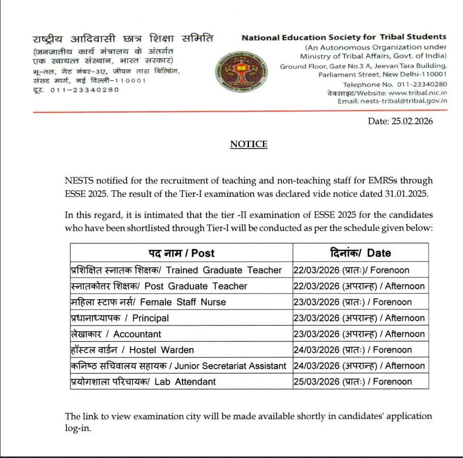 EMRS Tier-II Exam Date 2026 22 - 25 March 2026