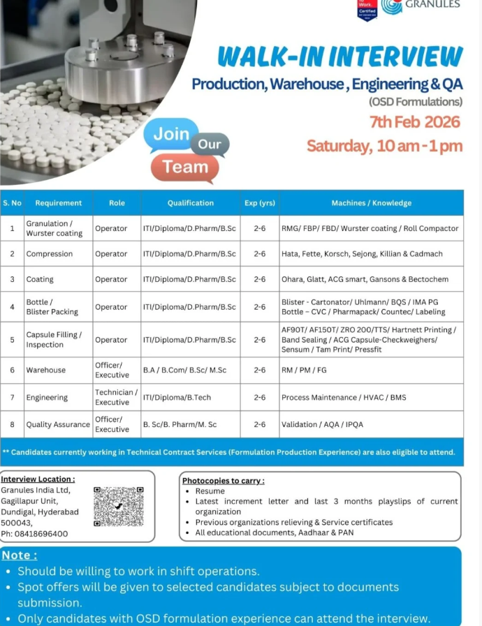 Granules India Ltd Walk-In Interview 2026 Pharma sector में career बनाने वाले experienced candidates के लिए एक golden opportunity लेकर आया है। Hyderabad स्थित Gagillapur Unit में OSD (Oral Solid Dosage) Formulations के लिए massive hiring drive आयोजित की जा रही है। यह walk-in interview खासतौर पर उन professionals के लिए है जिनके पास Production, Warehouse, Engineering और Quality Assurance में practical exposure है।