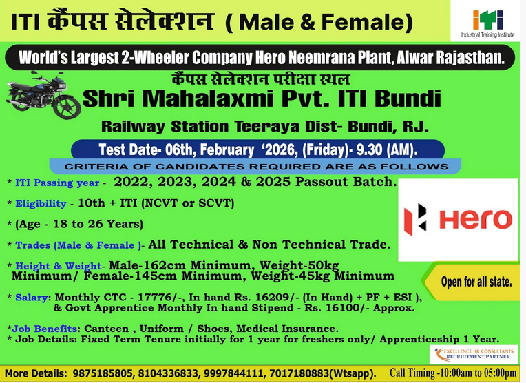 India ki sabse badi two-wheeler manufacturing company Hero Motocorp ne ITI Campus Placement 2026 announce kar diya hai. Yeh recruitment Neemrana Plant (Rajasthan) ke liye ho rahi hai, jisme male & female candidates, all trades, aur multiple pass-out batches eligible hain.