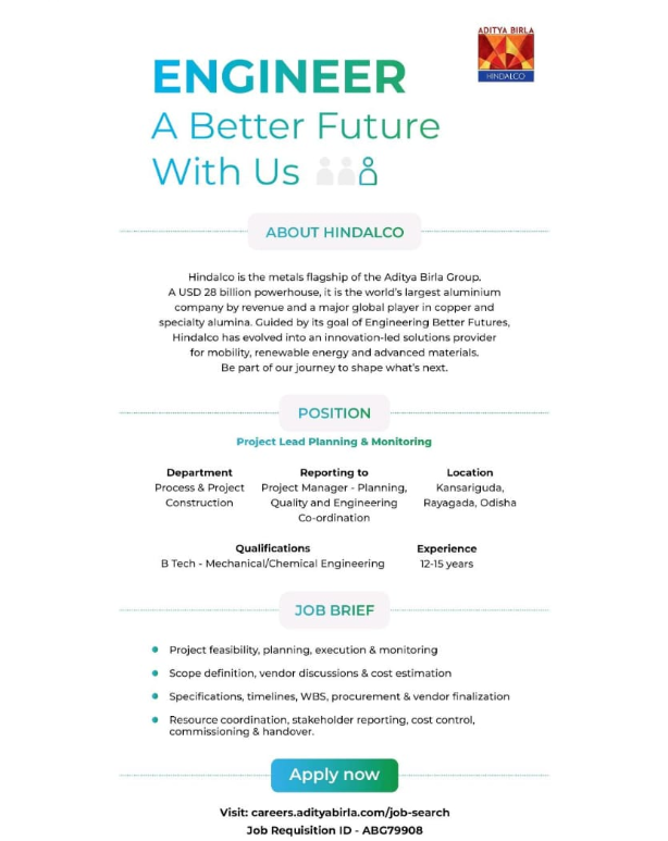Hindalco Industries Limited, the flagship metals company of the Aditya Birla Group, has officially announced the Hindalco Recruitment 2025 for the position of Project Lead – Planning & Monitoring. This Hindalco Project Lead Vacancy offers an excellent opportunity for experienced engineers with 12-15 years of experience to join a global leader in the metals industry. The Hindalco Job Openings 2025 are part of the company's continued expansion and innovation in mobility, renewable energy, and advanced materials sectors.