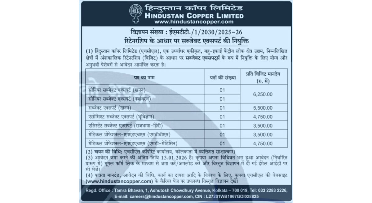 Hindustan Copper Limited Jobs 2026 — Subject Expert Vacancy Kolkata | Apply Online Before 13 Jan