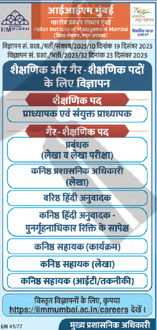 Indian Institute of Management Mumbai (IIM Mumbai) ने Recruitment 2025–26 के अंतर्गत शैक्षणिक (Teaching) और गैर-शैक्षणिक (Non-Teaching) पदों के लिए official notification जारी कर दिया है। यह भर्ती उन candidates के लिए एक golden opportunity है जो prestigious IIM system का हिस्सा बनना चाहते हैं।