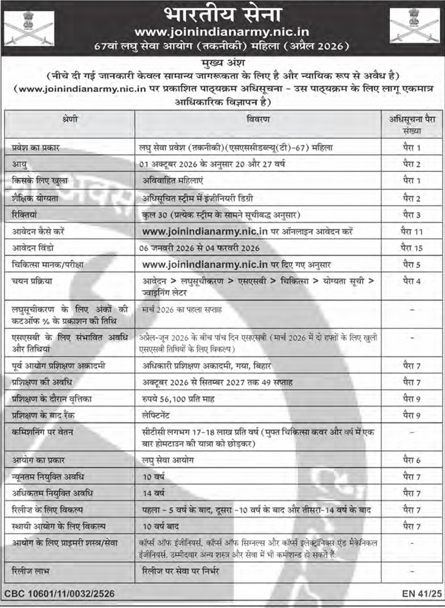 Indian Army Women Recruitment 2026 शानदार मौका है जो विवाहित और योग्य महिलाओं को Lady Officer बनना चाहते हैं। Indian Army ने 67th Short Service Commission (SSC—Technical) Women Course (April 2026) के लिए औपचारिक घोषणा की है।