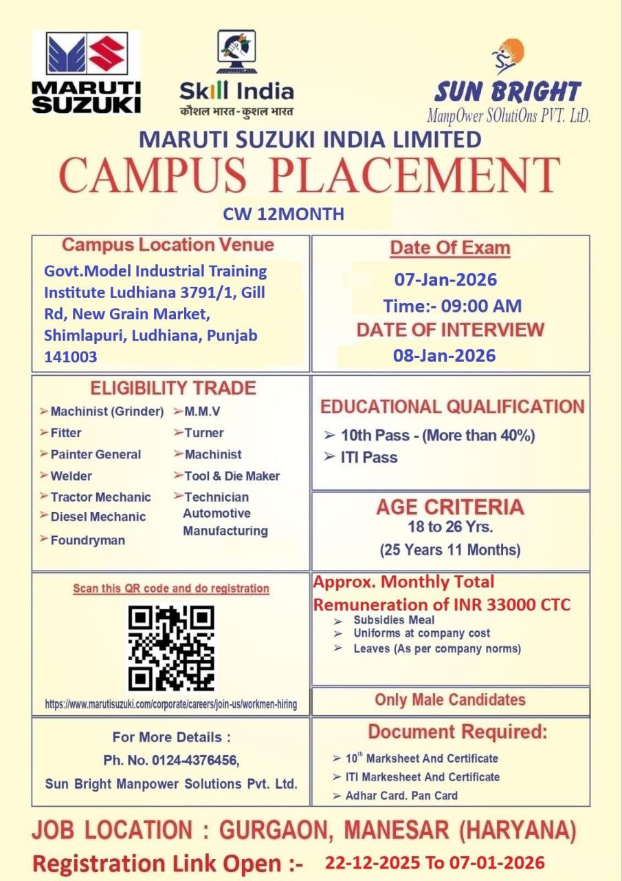 Maruti Suzuki CW Recruitment 2026 एक best private job opportunity है ITI युवाओं के लिए। अगर आप चाहते हैं stable income + big brand experience, तो आज ही apply करें।