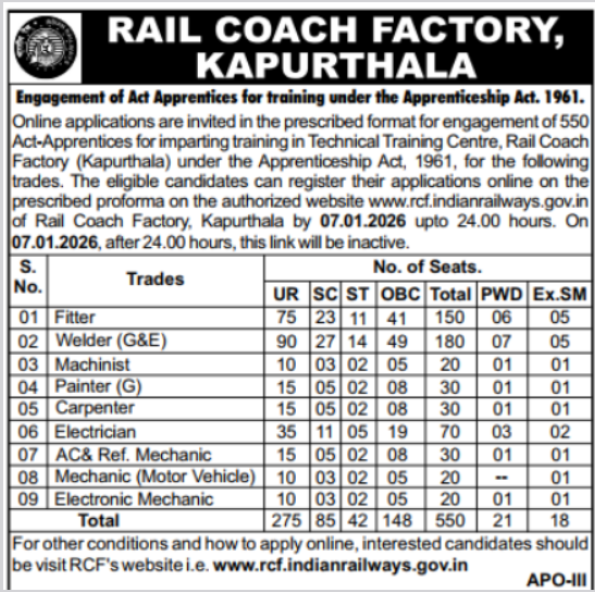 Rail Coach Factory (RCF) Kapurthala has officially released the notification for RCF Kapurthala Apprentice Recruitment 2025 with a total of 550 vacancies for Trade Apprentice positions. This RCF Railway Apprentice Online Form 2025 announcement offers a golden opportunity for 10th pass and ITI certificate holders to join the prestigious railway organization. The RCF Kapurthala Apprentice Apply Online process will commence in December 2025. Interested candidates can apply until 07 January 2026 for these government apprenticeship positions through the official RCF website.