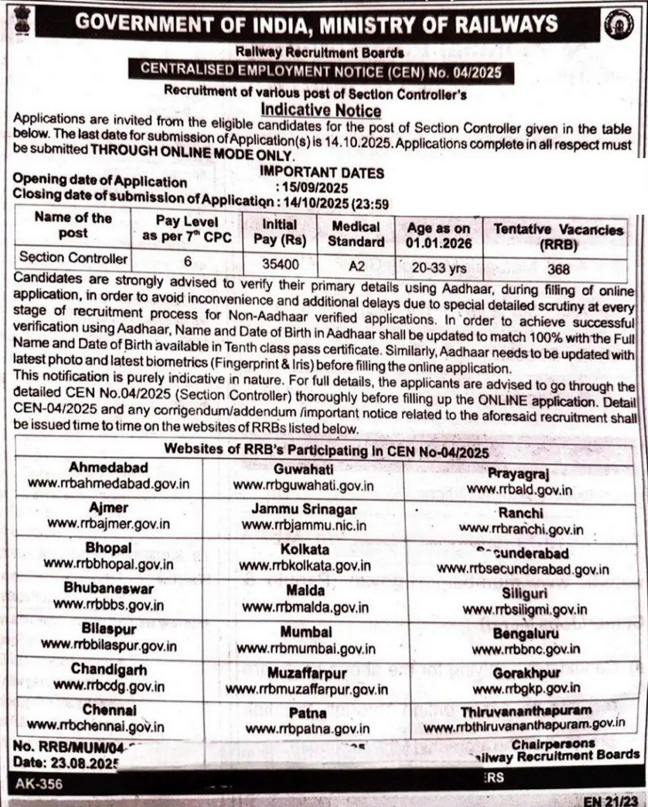 रेलवे भर्ती बोर्ड (आरआरबी) सेक्शन कंट्रोलर भर्ती 2025 - 368 रिक्तियों के लिए