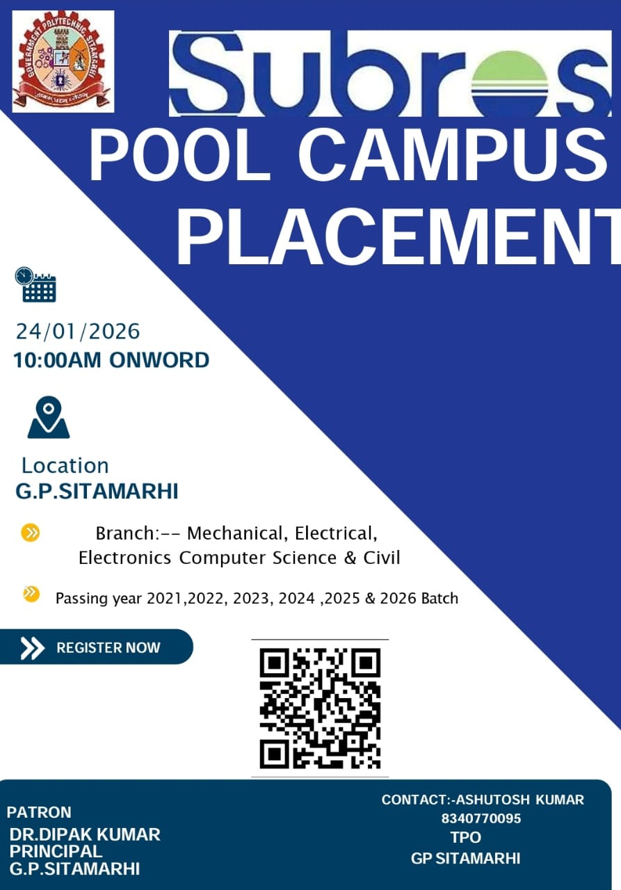 इसी कड़ी में Government Polytechnic Sitamarhi (GP Sitamarhi), Bihar में Subros Pool Campus Placement Drive 2026 का official notification सामने आया है। यह placement drive उन सभी students के लिए बेहद खास है जो Mechanical, Electrical, Electronics, Computer Science और Civil Engineering background से आते हैं।