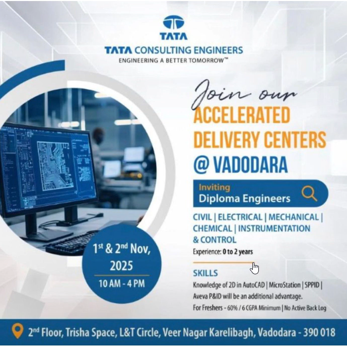 Tata Consulting Engineers (TCE) is recruiting Diploma Engineers for its Accelerated Delivery Centers in Vadodara. This recruitment drive offers opportunities for Diploma Engineers across various departments. The walk-in interview will be held on 1st and 2nd November 2025.
