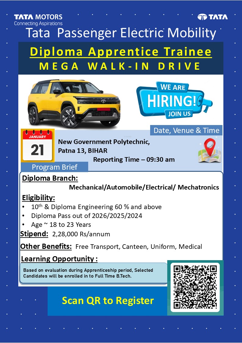 यह Walk-In Drive 21 January 2026 को New Government Polytechnic, Patna-13 (Bihar) में आयोजित किया जाएगा। जो छात्र Mechanical, Automobile, Electrical या Mechatronics Diploma कर चुके हैं, वे इस drive में शामिल हो सकते हैं।