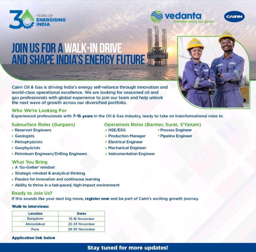 वेदांता केयर्न ऑयल एंड गैस वॉक-इन ड्राइव 2025 - अनुभवी पेशेवरों के लिए सुनहरा मौका