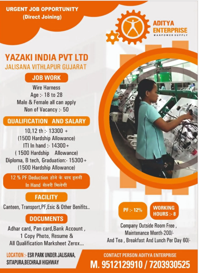Agar aap Automobile Manufacturing Jobs 2026 me interest rakhte hain aur direct joining ke through job start karna chahte hain, to Yazaki India Pvt Ltd Recruitment 2026 ek excellent option hai. Competitive salary, PF-ESIC benefits, accommodation aur food facility ke saath yeh job freshers ke liye bhi ek strong foundation create karti hai.